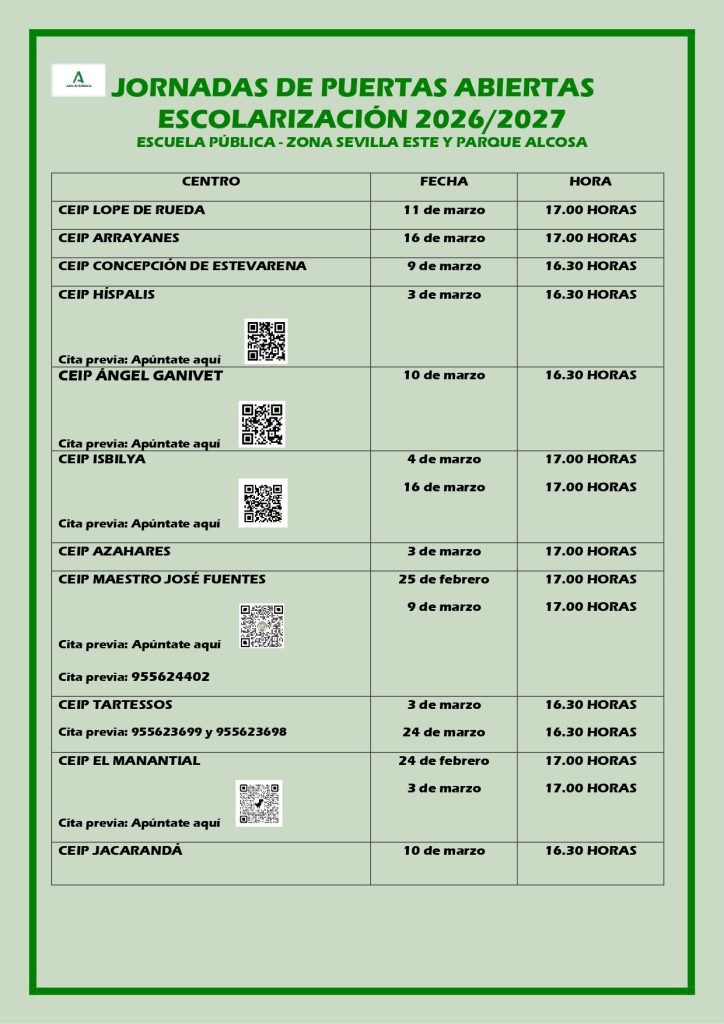 En nuestra zona de Sevilla Este–Alcosa, los distintos centros educativos abrirán sus puertas para que las familias puedan conocer de primera mano sus instalaciones, proyectos educativos y equipos docentes.